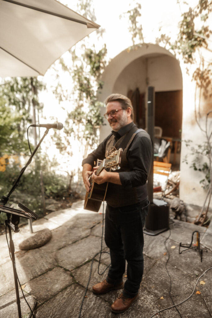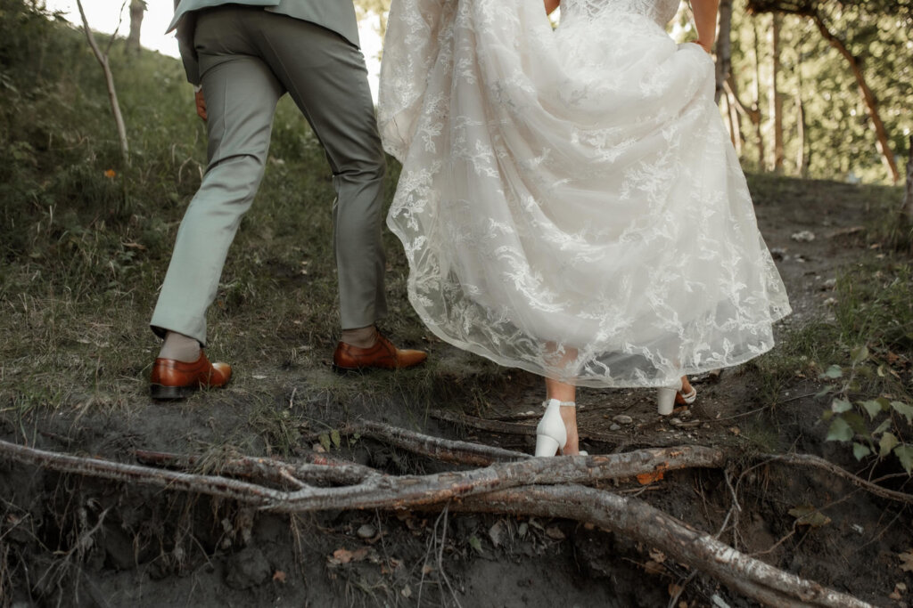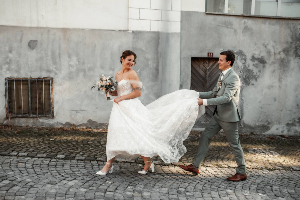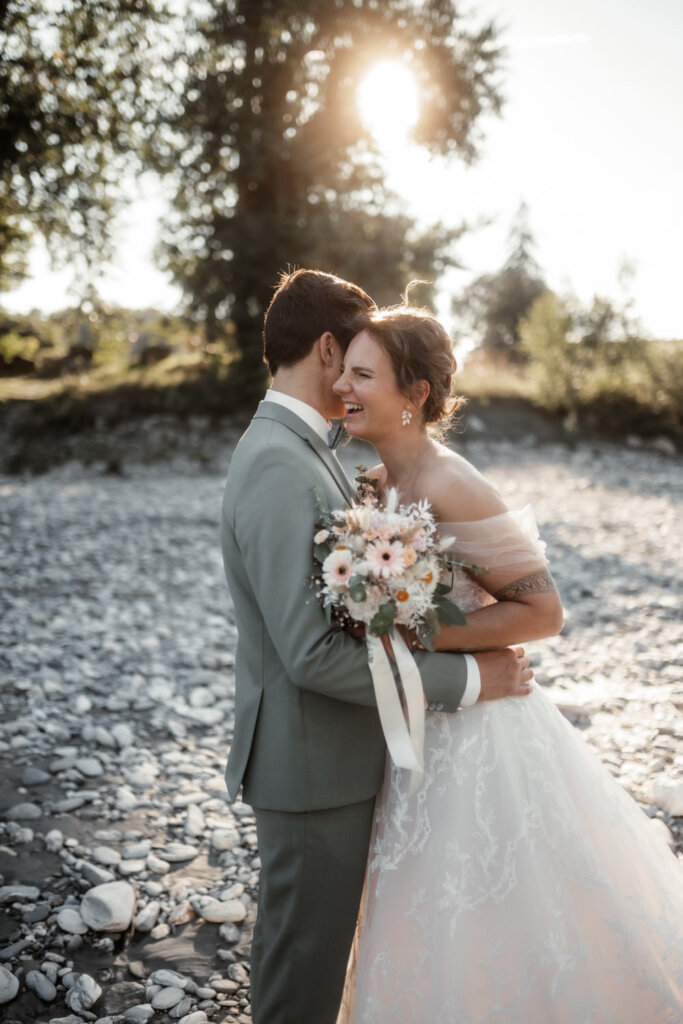 Die Trauung im Schlossgarten war intim, emotional und wunderschön eingebettet in das Gesamtbild des Tages. Ein eingespieltes Team an Dienstleistern machte diesen Moment besonders stimmig. Die Traurede war modern, persönlich und abwechslungsreich, voller ehrlicher Worte und leiser wie auch freudiger Momente. Musikalisch wurde die Zeremonie von einem Gitarristen begleitet, der die Dramaturgie feinfühlig aufnahm und unterstützte. Während des Apéros trafen weitere Gäste ein, die den Nachmittag mit Leben, Gesprächen und fröhlicher Stimmung füllten. Später nutzten wir die Golden Hour für das Paarshooting an der wunderschönen Sandbank des Rheins. Für die Braut war das Laufen zwischen den Steinen mit hohen Schuhen zwar eine kleine Herausforderung, doch mit etwas Geduld und viel Lachen entstanden genau dort besonders natürliche und emotionale Bilder.