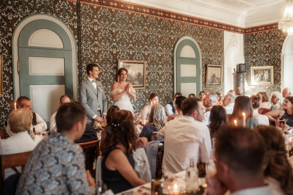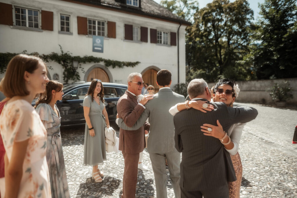 Mein Tag endete kurz vor dem Dinner. Als ich miterlebte, wie das Brautpaar beim Eintreten in den Saal mit Applaus empfangen wurde, begleitet von Glückwünschen und einem ersten gemeinsamen Anstossen, war für mich klar: Diese Geschichte ist rund. Mit einem guten Gefühl und vielen starken Bildern im Gepäck konnte ich diesen Hochzeitstag auf Schloss Reichenau für mich abschliessen- als eine Geschichte voller Leichtigkeit, Kreativität und echter Momente.